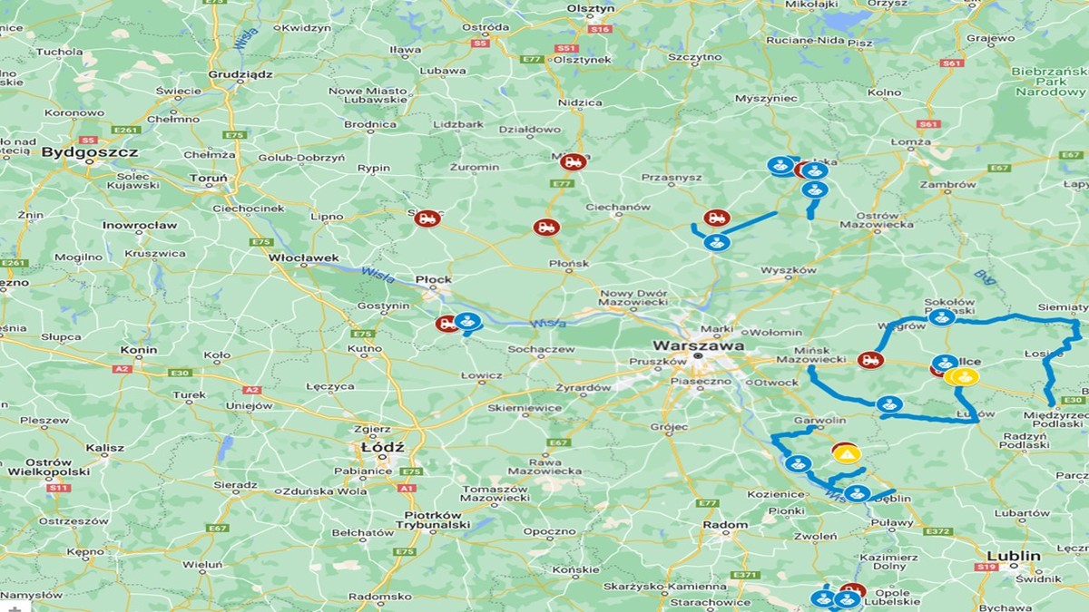 Poniżej znajduje się poglądowa mapa utrudnień na drogach garnizonu mazowieckiego, która aktualizowana jest przez Wydział Ruchu Drogowego KWP zs. w Radomiu.