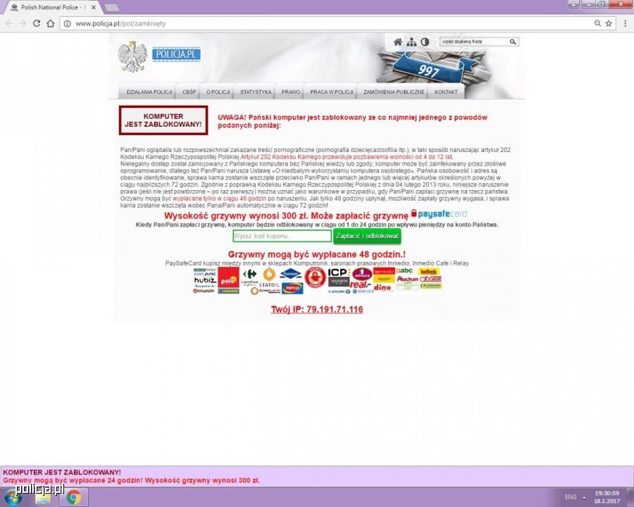 Przeglądając strony internetowe można napotkać na komunikat o rzekomej blokadzie komputera przez policję i konieczności zapłacenia grzywny. Informacja ta – opatrzona graficznymi elementami skopiowanymi ze strony internetowej polskiej policji – pojawia się wewnątrz przeglądarki i zazwyczaj wyświetla się w trybie pełnoekranowym