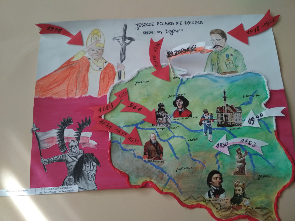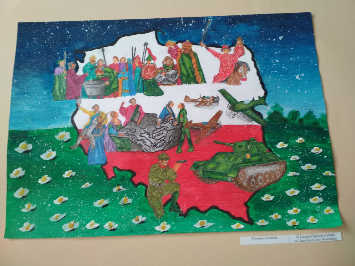 W kategorii ?RECYTACJA? finaliści deklamowali wybrane wiersze poświęcone ojczyźnie i walce o niepodległość autorstwa Jana Pawła II lub dowolnego współczesnego poety. W kategorii ?WOKALNEJ? uczestnicy zaprezentowali piosenki patriotyczne. W kategorii ?PLASTYCZNEJ? uczniowie przygotowali symboliczne mapy Polski, które uwzględniają historię naszego kraju, ważne postaci historyczne, najpiękniejsze miejsca itp. Celem konkursu była popularyzacja poezji współczesnej i twórczości Jana Pawła II, krzewienie wśród młodzieży idei i wartości głoszonych przez Jana Pawła II, a także rozwijanie współpracy pomiędzy powiatowymi szkołami ponadgimnazjalnymi i innymi placówkami kulturalnymi oraz promocja uzdolnionych uczniów ze szkół ponadgimnazjalnych powiatu wołomińskiego.