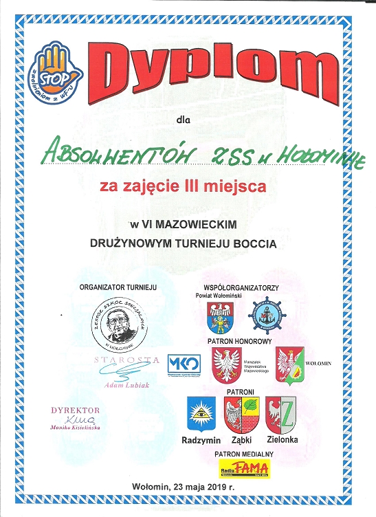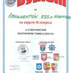 III miejsce ? reprezentacja Absolwentów Zespołu Szkół Specjalnych w Wołominie w składzie: Filip Romański (kapitan), Katarzyna Grzymała, Marcin Falewski