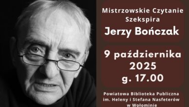 Zapraszamy na Mistrzowskie Czytanie Szekspira z aktorem Jerzym Bończakiem, w dniu 9 października (czwartek) 2025 roku o godz. 17:00 do Powiatowej Biblioteki Publicznej