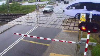 Kolejowy monitoring zarejestrował niebezpieczne zachowanie kierowcy skody. Mężczyzna wjechał na przejazd kolejowy pomimo opuszczonych rogatek i włączonej sygnalizacji o nadjeżdżającym pociągu. W sobotni