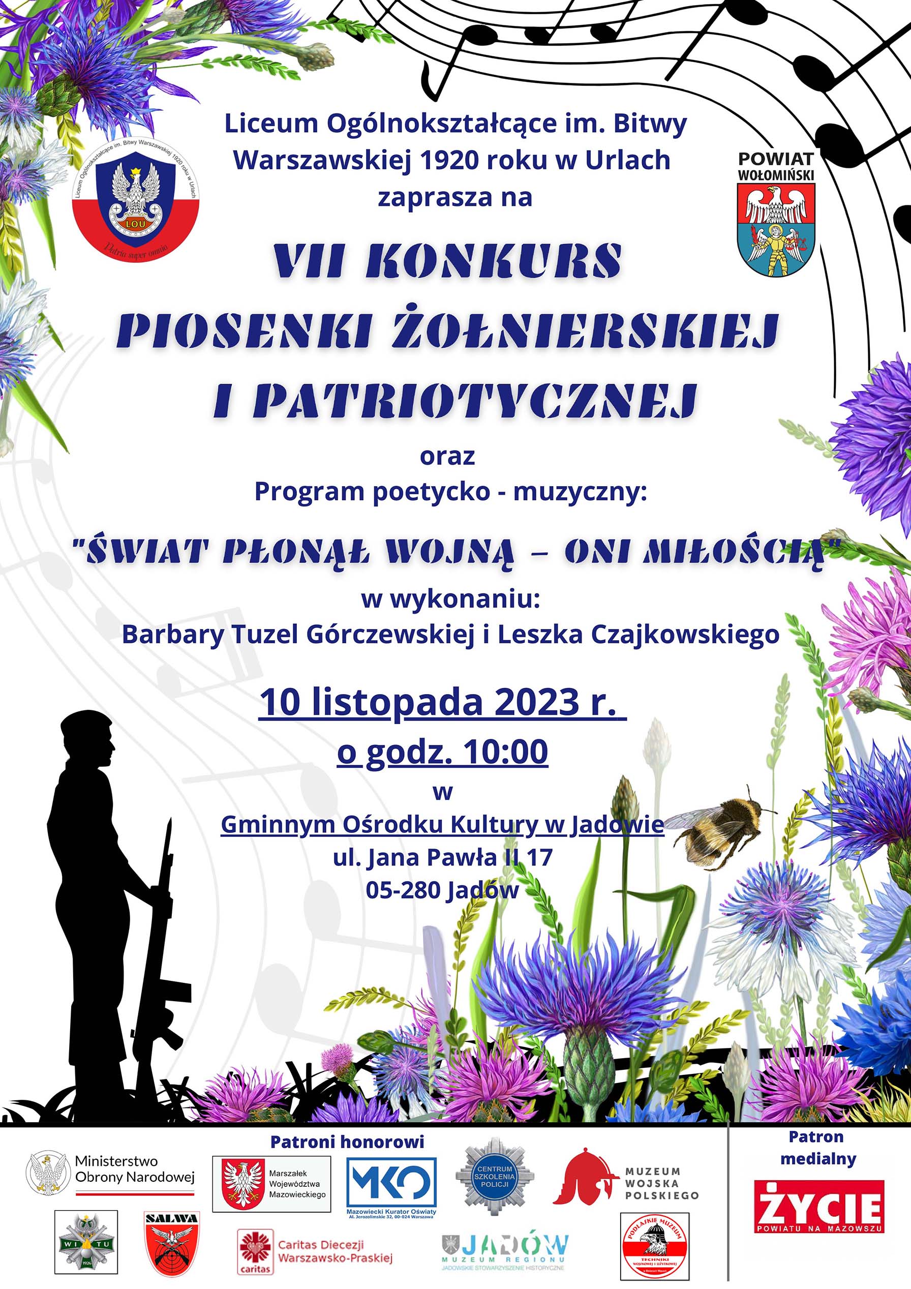 Dyrektor LO im. Bitwy Warszawskiej 1920 roku w Urlach zaprasza na VII Konkurs Piosenki Żołnierskiej i Patriotycznej oraz Program poetycko muzyczny Świat płonął wojną – oni miłością w którym wystąpią: Barbara Tuzel Górczewska oraz Leszek Czajkowski, który odbędzie się 10 listopada od godz. 10.00 w GOK Jadów.