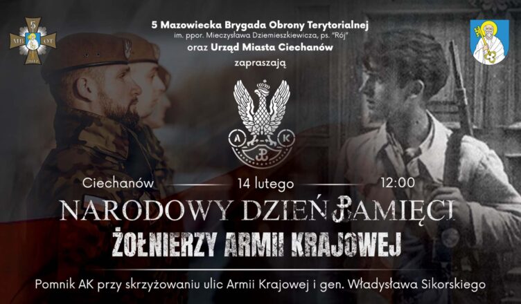 W najbliższy piątek, 14 lutego br. w Ciechanowie odbędzie się uroczystość z okazji Narodowego Dnia Pamięci Żołnierzy Armii Krajowej. Wydarzenie zorganizowane przez 5 Mazowiecką Brygadę Obrony Terytorialnej im. ppor. Mieczysława Dziemieszkiewicza, ps. „Rój” oraz Urząd Miasta Ciechanów rozpocznie się o godzinie 12:00 przy Pomniku Armii Krajowej i Wojska Polskiego przy skrzyżowaniu ulic Armii Krajowej i gen. Władysława Sikorskiego.