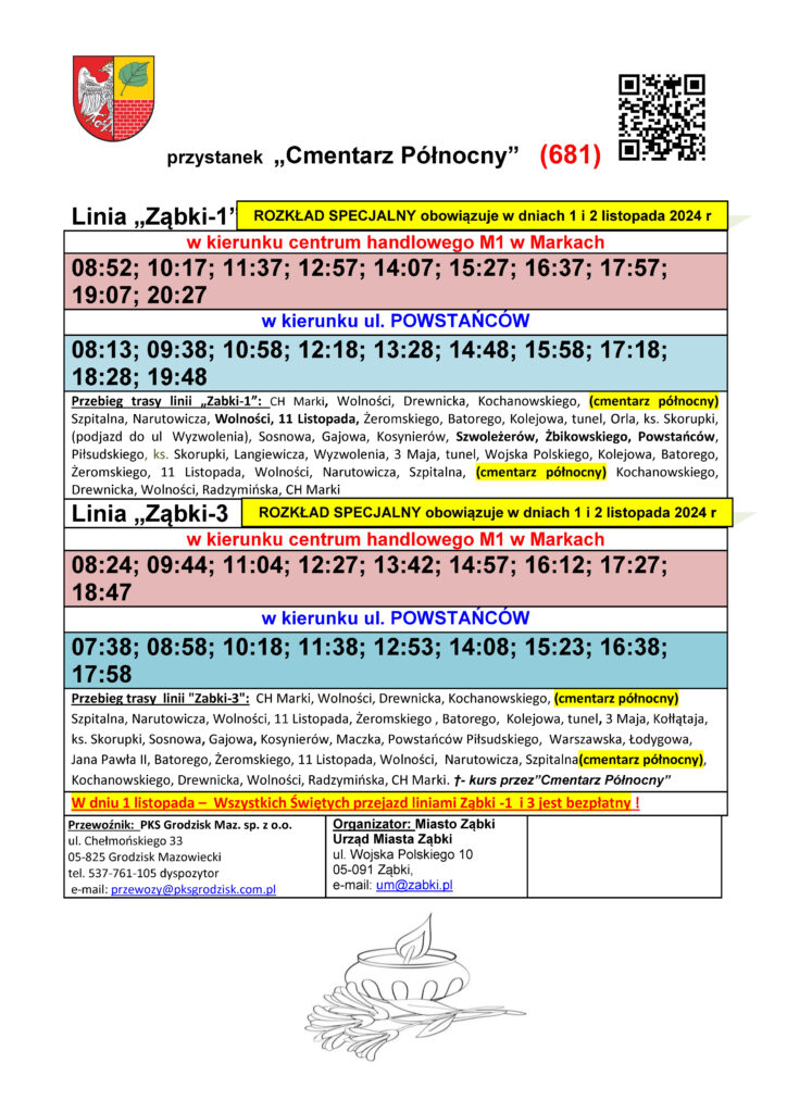 Rozkład specjalny na piątek i sobotę dla linii  Ząbki-1 i Ząbki-3 będzie bazował na rozkładzie sobotnim, Tak aby kursy realizowane w godzinach 8-19 zapewniały dojazd i powrót z Cmentarza Północnego i kursy 1.XI były realizowane częściej niż w przypadku standardowego rozkładu. Autobusy linii  Ząbki – 1 i Ząbki-3 w ciągu dnia będą podjeżdżały na przystanek Cmentarz Północny zarówno jadąc w kierunku CH Marki jaki i w kierunku Powstańców.