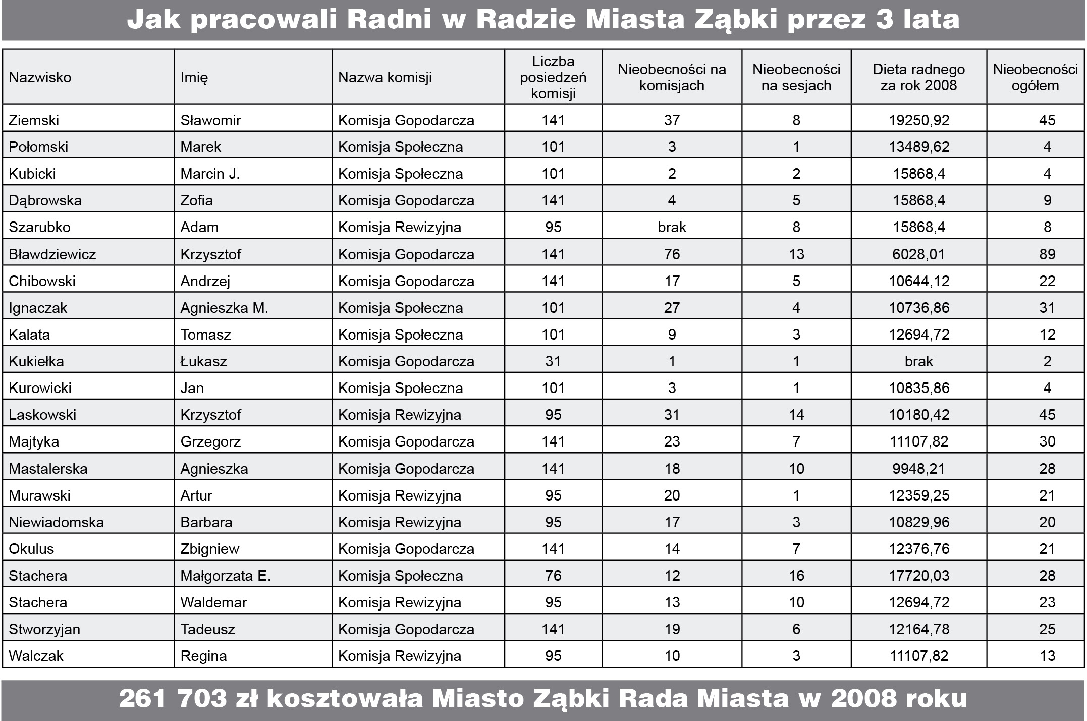 Rada Miasta Ząbki pomimo upływu lat nie straciła na oryginalności. Próba sprawdzenia przez naszą redakcyjną koleżankę frekwencji radnych okazała się nie być sprawą prostą i oczywistą, gdyż w Ząbkach obowiązują dwie listy obecności na sesji Rady Miasta. Pierwsza podpisywana (sprawdzana) na początku sesji i druga na jej zakończenie. – Brak obecności na którejkolwiek z tych list zaliczany jest jako nieobecność na sesji w danym dniu ? wyjaśniła nam Pani z Biura Rady Miasta Ząbki.
