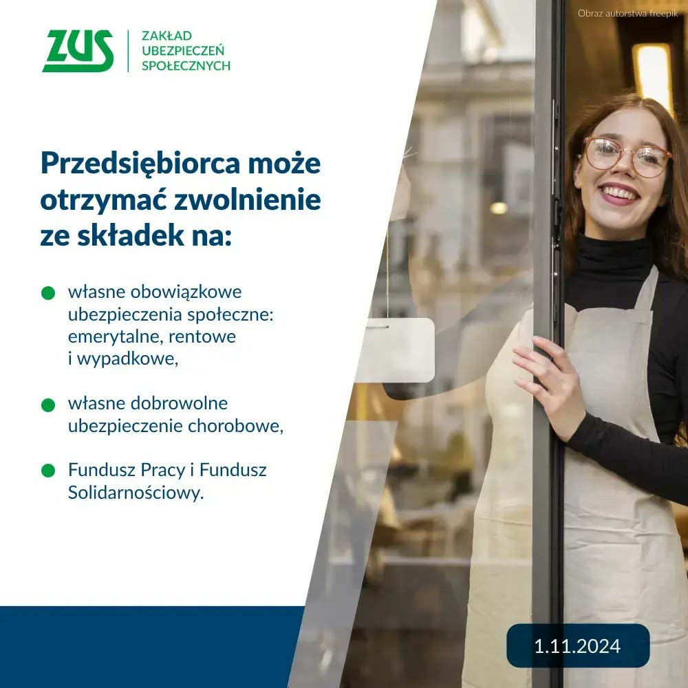 Gdy przedsiębiorca złoży wniosek, może uzyskać zwolnienie z opłacenia składek na: