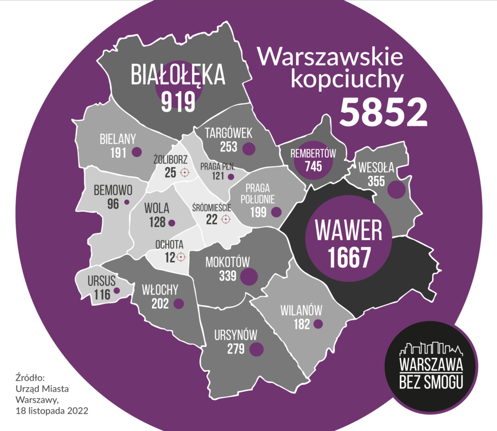 W 2017 roku liczbę warszawskich „kopciuchów” szacowano na 18 tysięcy. Najnowsza inwentaryzacja Urzędu Miasta ustaliła tę liczbę na 5852. Według informacji z Urzędu Miasta 1651 umów na wymianę kotła jest obecnie realizowanych, co oznacza dalsze zmniejszenie liczby dymiących kotłów. Najwięcej, bo aż 1667 „kopciuchów” pozostało w dzielnicy Wawer, tuż za nią jest Białołęka (919) i Rembertów (745). Najmniej kotłów pozostało w Śródmieściu (22), Ochocie (12) i Żoliborzu (25).