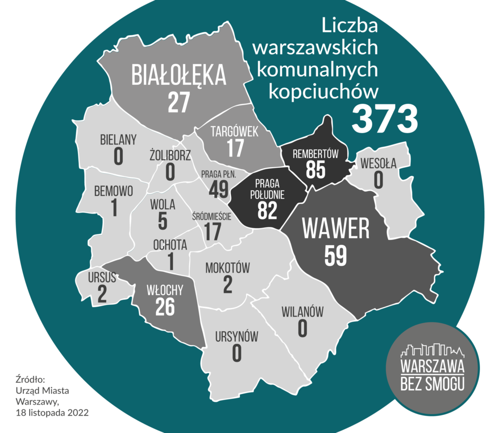 Dużo lepiej idzie wymiana kotłów w zasobach miejskich. Cztery lata temu miasto było właścicielem 2114 „kopciuchów”. Na dzień 18 listopada 2022 r. do wymiany pozostało jeszcze 373 kotły. Najwięcej miejskich kotłów znajduje się na Pradze Południe, Rembertowie i Wawrze.