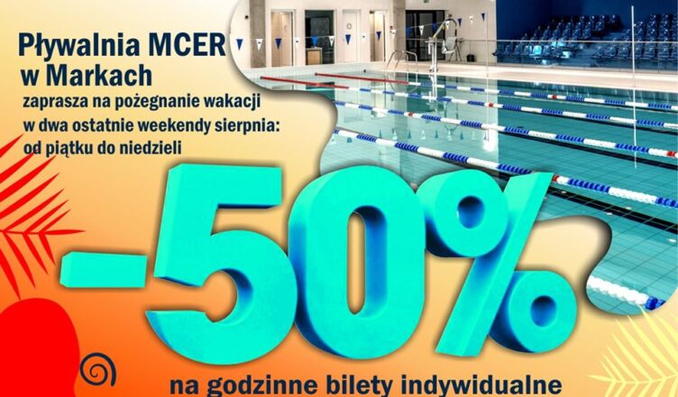 Specjalnie dla Was przygotowaliśmy akcję promocyjną na pożegnanie wakacji – 50 % rabatu na indywidualne godzinne wejście na basen!Zapraszamy w dwa ostatnie weekendy sierpnia od piątku do niedzieli. Czeka na Was relaks w bezpiecznych warunkach, 60-metrowa zjeżdżalnia, nowoczesny basen sportowy i brodzik dla dzieci z atrakcjami. – czytamy na stronie UM Marki