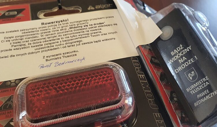 Jest ona skierowana do rowerzystów z terenu Gminy Tłuszcz, którzy często poruszają się po drodze bez odpowiedniego oświetlenia, przez co stwarzają zagrożenie dla siebie oraz innych uczestników ruchu drogowego. Podczas zatrzymania przez policję za brak wymaganego przepisami prawa oświetlenia roweru grozi kara grzywny. Dzięki zorganizowaniu przez Burmistrza Tłuszcza akcji ?Widzimy się na drodze? mieszkańcy Gminy Tłuszcz unikną mandatu. W ramach pouczenia dostaną pakiet składający się z białej oraz czerwonej lampki do zamontowania na rowerze. Pamiętajmy, że dobre oświetlenie to nie tylko wymogi prawne, ale przede wszystkim kwestie związane z naszym bezpieczeństwem, szczególnie w sezonie jesienno- zimowym, kiedy bardzo szybko zapada zmrok. Świećmy dla innych dobrym przykładem i od teraz już zawsze bądźmy widoczni.