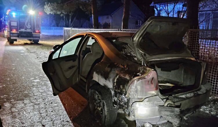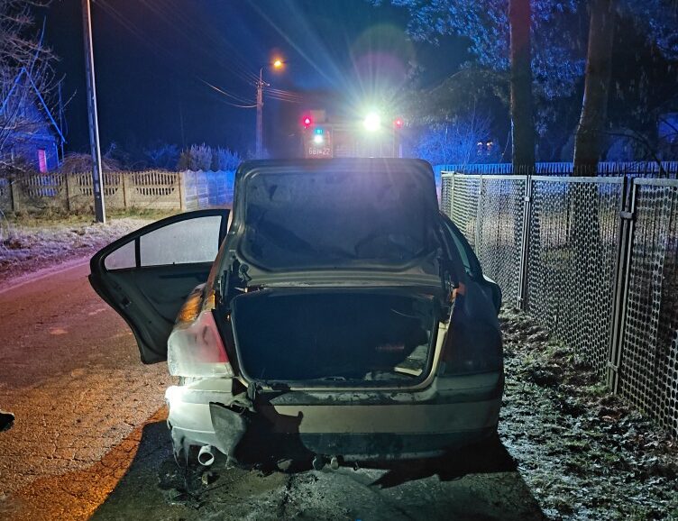 Po przybyciu służb zastano pojazd w znacznym stopniu objęty ogniem. Jak widać na zdjęciu, płomienie doszczętnie zniszczyły tylną część auta oraz wnętrze, a wysoka temperatura doprowadziła do poważnych uszkodzeń karoserii i elementów konstrukcyjnych. Strażacy niezwłocznie przystąpili do działań gaśniczych, podając prądy wody i zabezpieczając miejsce zdarzenia. Dzięki szybkiej reakcji udało się opanować ogień i zapobiec jego rozprzestrzenieniu się na pobliską zabudowę oraz ogrodzenia.