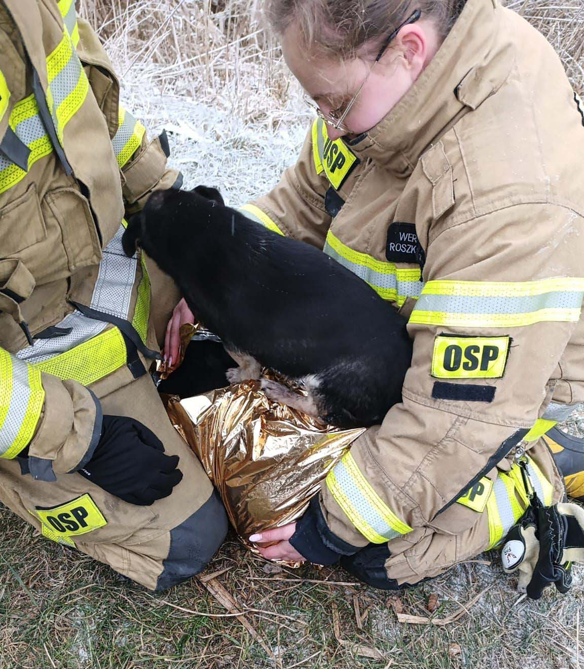 Podczas zimowego połowu druh Mianowski zauważył, że na zamarzniętej tafli wody znajduje się uwięziony pies. Zwierzę prawdopodobnie wpadło w panikę i nie było w stanie samodzielnie wydostać się z lodowej pułapki. Nie bacząc na własne bezpieczeństwo, strażak postanowił działać natychmiast. Wykorzystując swoje umiejętności oraz doświadczenie w akcjach ratowniczych, ostrożnie dotarł do wyziębionego czworonoga, a następnie przetransportował go w bezpieczne miejsce.