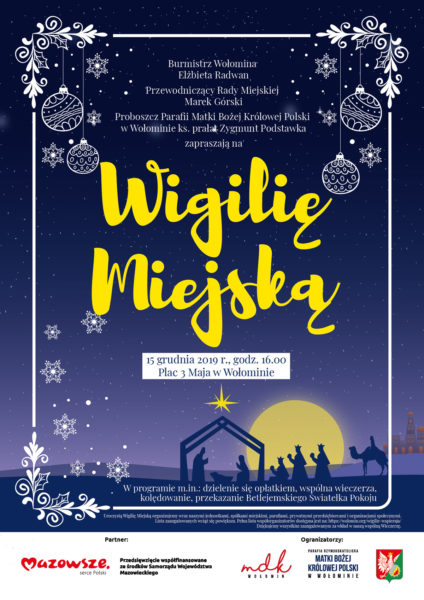 15 grudnia 2019 r. o godzinie 16:00 już po raz trzeci mieszkańcy Wołomina spotkają się na Placu 3 Maja, by wspólnie z rodziną, przyjaciółmi i sąsiadami przeżywać Wigilię Miejską w Wołominie.