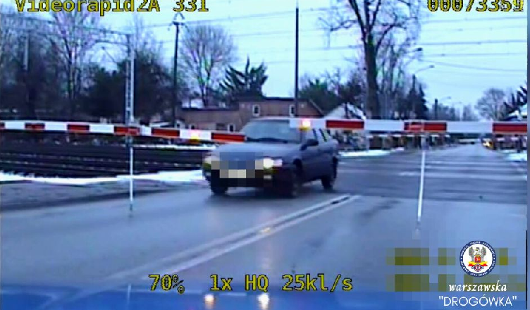 Policjantów warszawskiej „drogówki” chyba już nic nie powinno dziwić. Oznakowanym radiowozem wyposażonym w wideorejestrator, zatrzymali się przed opuszczonymi zaporami – normalna sytuacja. Jednak nie do końca, bo zarejestrowali, jak z przeciwnego kierunku kierowca Daewoo objeżdża zapory, przejeżdża przez torowisko i zatrzymuje się tuż obok nich…