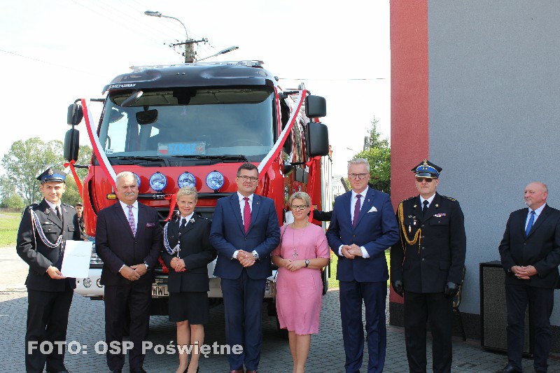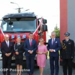 Następnie wręczenia aktu przekazania samochodu i kluczyków do średniego samochodu ratowniczo-gaśniczego dokonali wspólnie Pani Bożena Żelazowska – Poseł na Sejm RP, Pan Piotr Uściński – Poseł na Sejm RP, Pani Katarzyna Lubiak ? Radna Sejmiku Województwa Mazowieckiego, Pan Adam Lubiak – Starosta wołomiński, bryg. Andrzej Wysocki – Komendant Powiatowy Państwowej Straży Pożarnej w Wołominie oraz Wójt Gminy Poświętne Sylwester Niżnik. Po symbolicznym przekazaniu nastąpiła prezentacja nowego pojazdu.