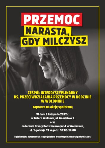 Zespół Interdyscyplinarny ds. Przeciwdziałania Przemocy w Rodzinie w Wołominie w dniu 9 listopada 2022 r. organizuje akcję społeczną pn. „Przemoc narasta, gdy milczysz”.