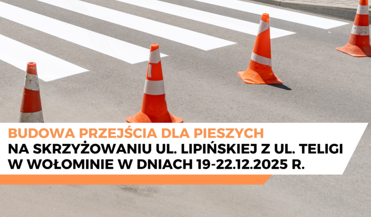 W dniach 19–22 grudnia 2025 r. na skrzyżowaniu ul. Lipińskiej z ul. Teligi w Wołominie będą prowadzone roboty drogowe w ramach budowy nowego przejścia dla pieszych.