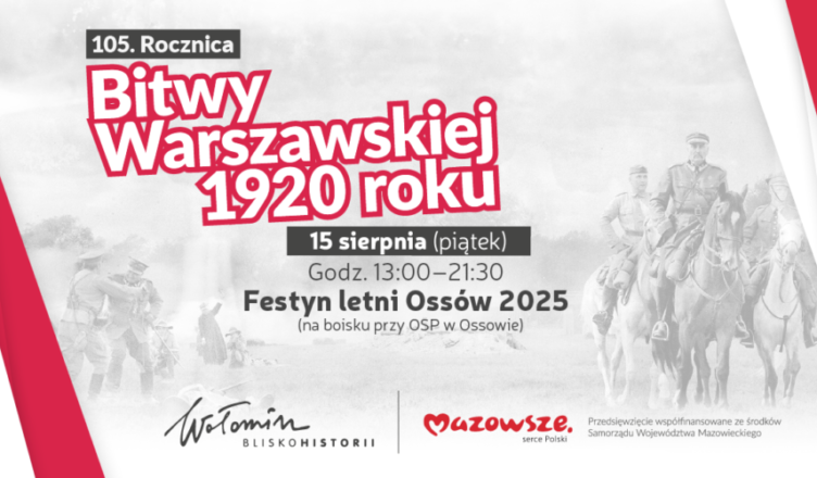 W ramach obchodów 105. rocznicy zwycięskiej Bitwy Warszawskiej odbędzie się wyjątkowe wydarzenie pełne dobrej energii, muzyki i wspólnego świętowania – Festyn Letni Ossów 2025! To będzie dzień, w którym historia łączy się z radością bycia razem. Elżbieta Radwan Burmistrz Wołomina wraz z sołtys Ossowa Violetą Boluk zapraszają całe rodziny, sąsiadów, przyjaciół i wszystkich gości do udziału w tym plenerowym święcie – na boisku przy OSP w Ossowie.