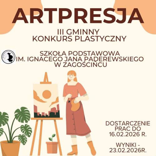 Szkoła Podstawowa im. Ignacego Jana Paderewskiego w Zagościńcu zaprasza do udziału w III Gminnym Konkursie Plastycznym „ArtPresja”, skierowanym do dzieci i młodzieży w