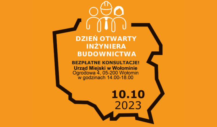 Dzień Otwarty Inżyniera Budownictwa pn. „Budowa, eksploatacja, remont Twojego obiektu – porozmawiaj o tym z inżynierem budownictwa”. Wydarzenie odbędzie się 10 października w godzinach 14:00-18:00 w Urzędzie Miejskim w Wołominie (sala 106, I piętro). Wstęp wolny!