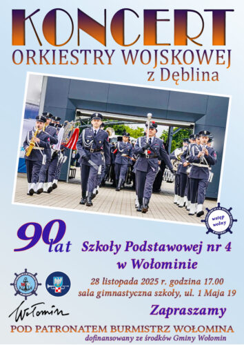 Z okazji jubileuszu 90-lecia Szkoły Podstawowej nr 4 im. Marynarki Wojennej RP w Wołominie już 28 listopada 2025 r. o godzinie 17.00 w sali gimnastycznej szkoły przy ul. 1 Maja 19 wystąpi Orkiestra Wojskowa z Dęblina.