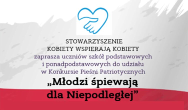 Stowarzyszenie „Kobiety wspierają Kobiety” zaprasza uczniów szkół podstawowych i ponad podstawowych do udziału w konkursie Pieśni Patriotycznych „Młodzi śpiewają dla Niepodległej”. W konkursie mogą wziąć udział dzieci i młodzież z powiatów: ostrołęckiego, makowskiego, ostrowskiego, pułtuskiego, wyszkowskiego, wołomińskiego, węgrowskiego, sokołowskiego, mińskiego, siedleckiego, łosickiego i garwolińskiego.