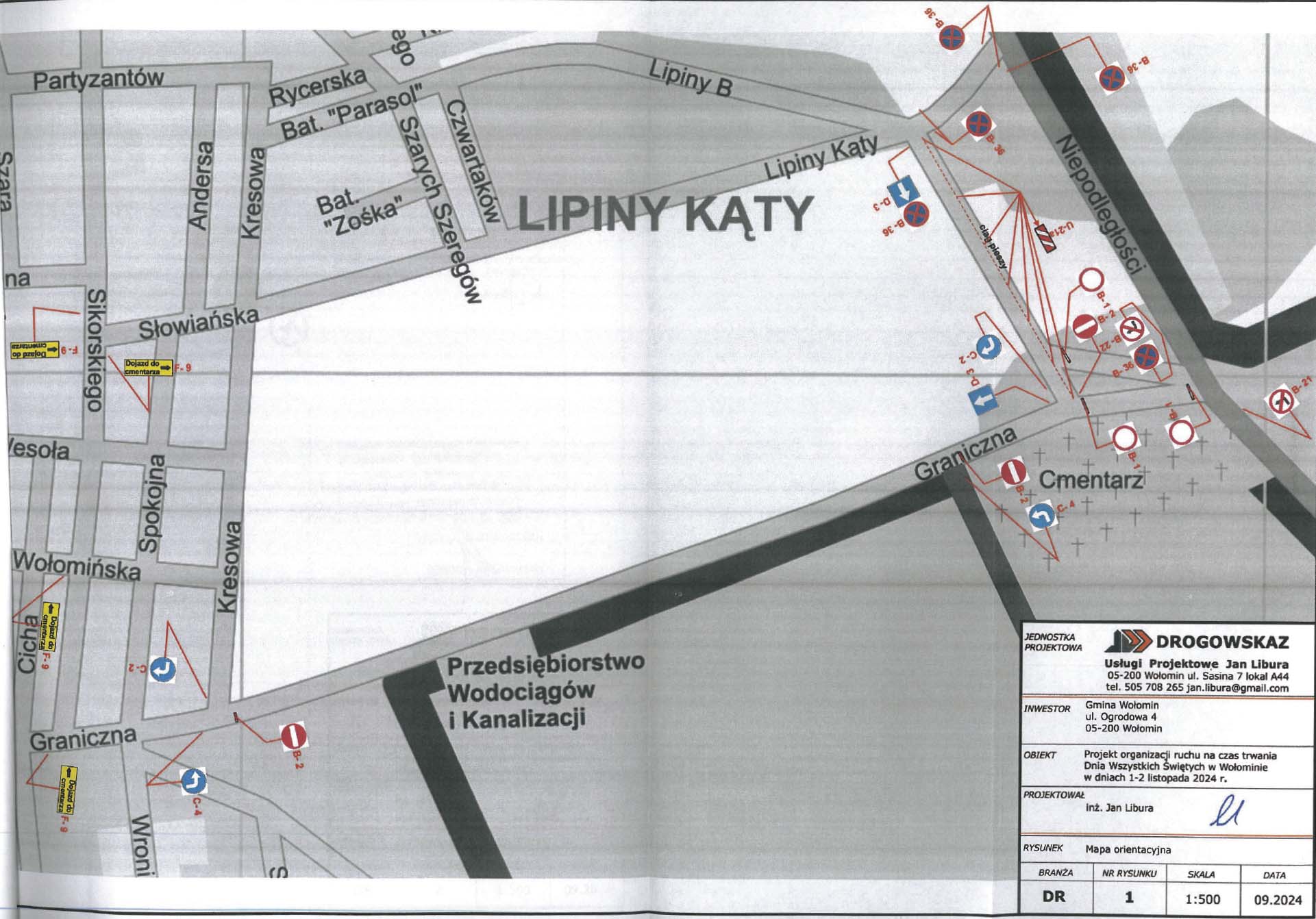 Projekt organizacji ruchu dojazdu do wołomińskiego cmentarza w okresie Wszystkich Świętych w Wołominie w dniach 01.11.2024 r. – 02.11.2024 r. (.PDF)