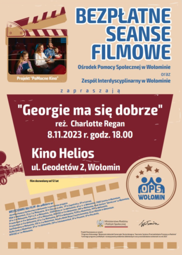 Już 8 listopada 2023 r. (środa) o godz. 18:00 kolejna projekcja filmowa! Ośrodek Pomocy Społecznej w Wołominie oraz Zespół Interdyscyplinarny w Wołominie serdecznie zapraszają do kina Helios przy ul. Geodetów 2 w Wołominie na film „Georgie ma się dobrze” w reżyserii Charlotte Regan.