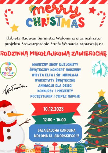 Elżbieta Radwan Burmistrz Wołomina oraz realizator projektu Stowarzyszenie Strefa Wsparcia zapraszają na RODZINNĄ MIKOŁAJKOWĄ ZAWIERUCHĘ. Już w tę niedzielę – 10.12.2023 r., w godzinach 12:00-16:00