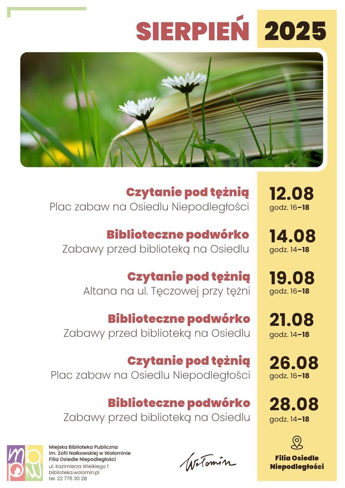 • Czytanie pod Tężnią – os. Niepodległości wtorki: 12 i 26 sierpnia, godz. 16:00 –18:00