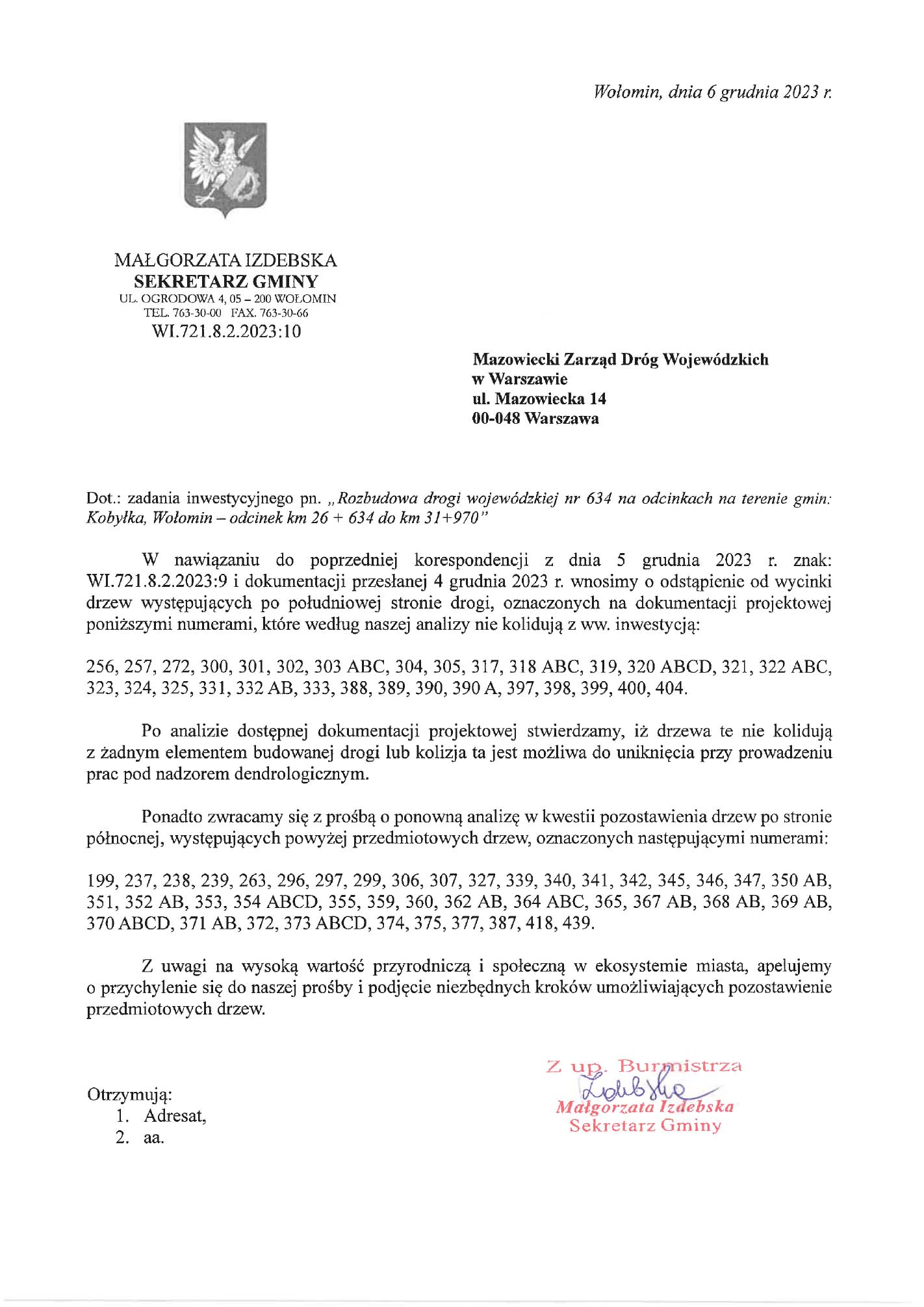 • Wniosek o odstąpienie od wycinki drzew występujących po południowej stronie drogi z dn. 6.12.2023 (.PDF)