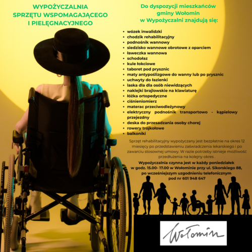 Z myślą o osobach potrzebujących wsparcia w codziennym funkcjonowaniu, a także ich opiekunach, na terenie gminy Wołomin działa Wypożyczalnia sprzętu wspomagającego i pielęgnacyjnego. Mieszkańcy gminy mogą bezpłatnie wypożyczyć sprzęt rehabilitacyjny i pielęgnacyjny na okres do 12 miesięcy (z możliwością przedłużenia). Wypożyczenie możliwe jest po przedstawieniu zaświadczenia lekarskiego oraz podpisaniu umowy.