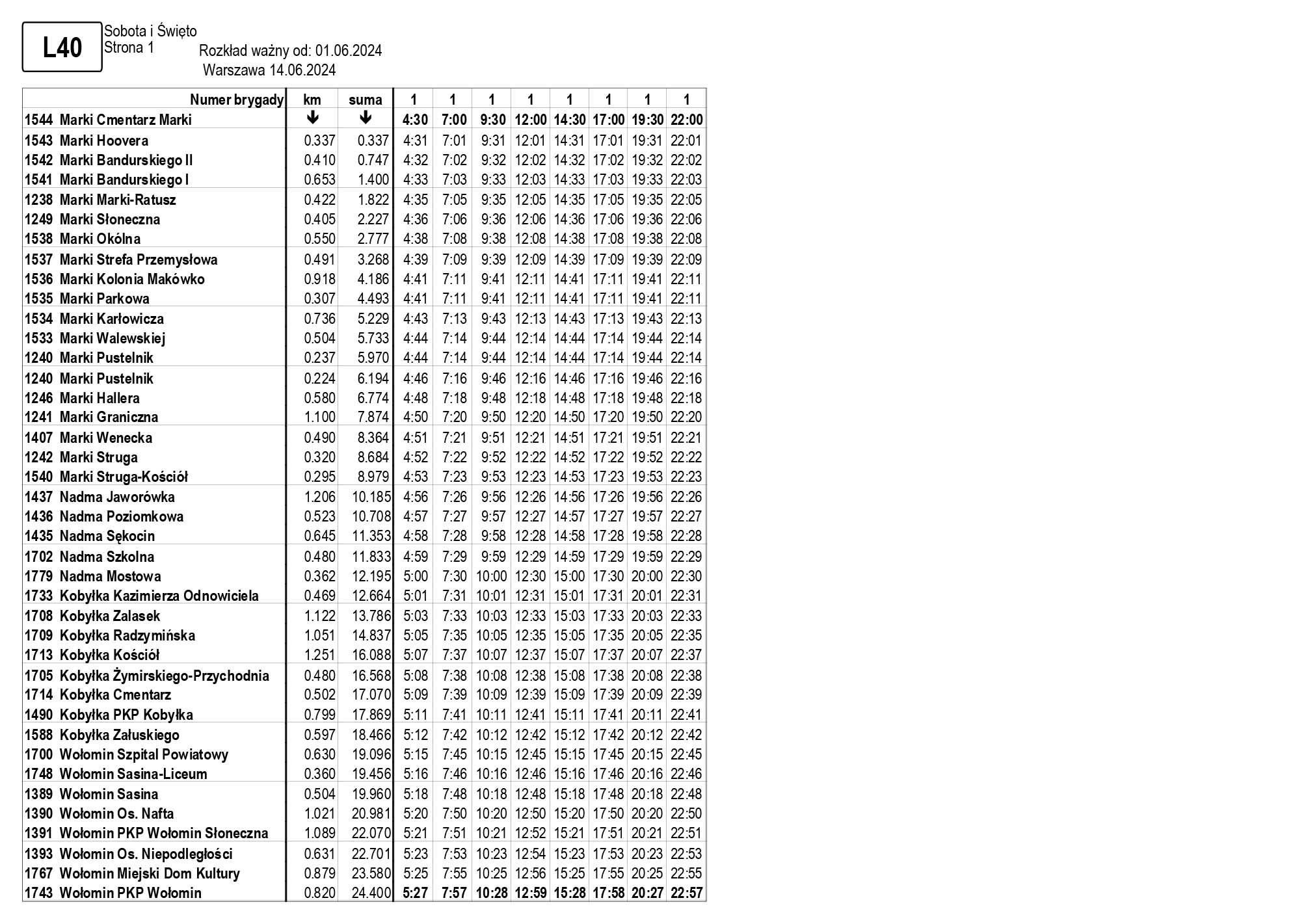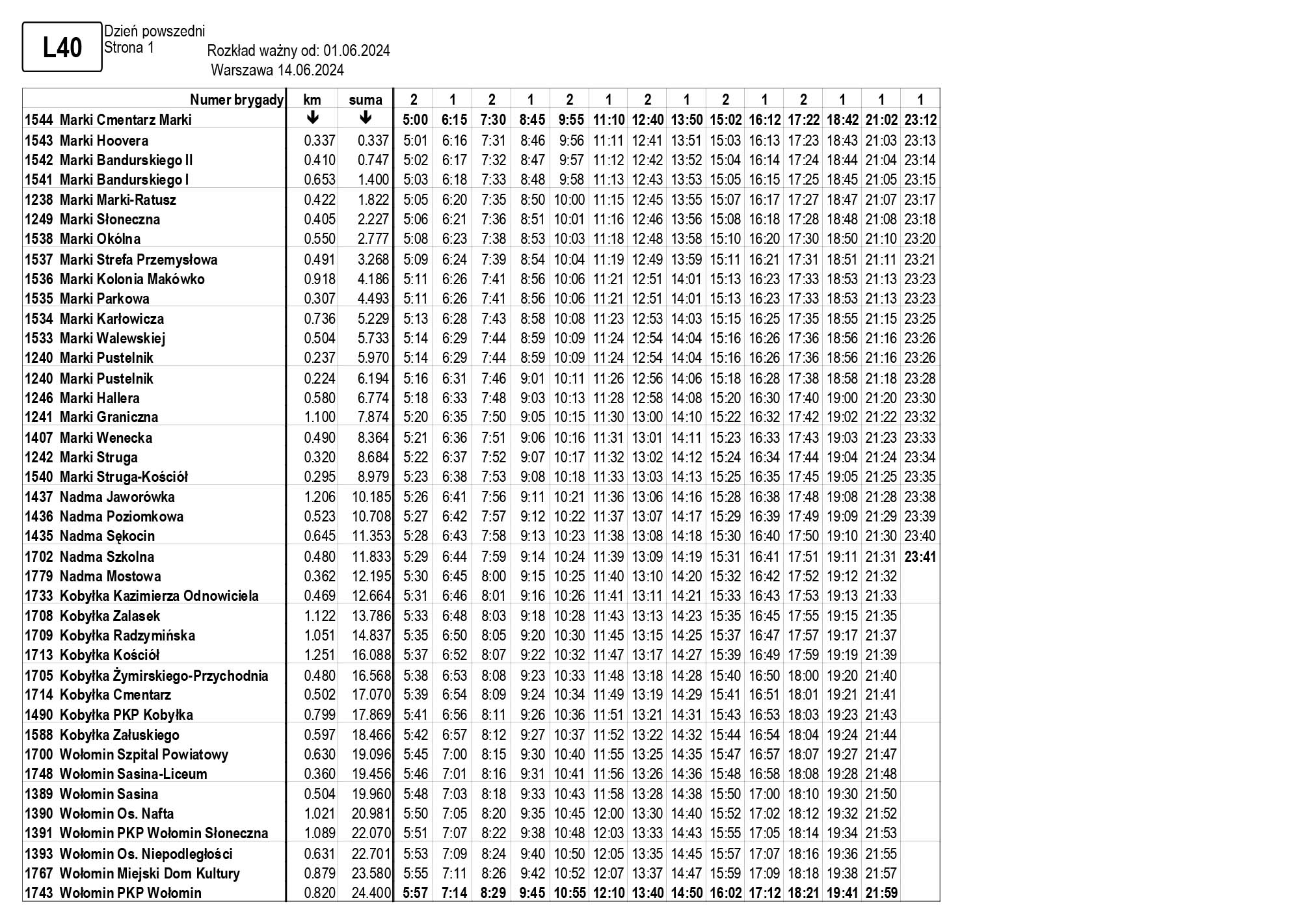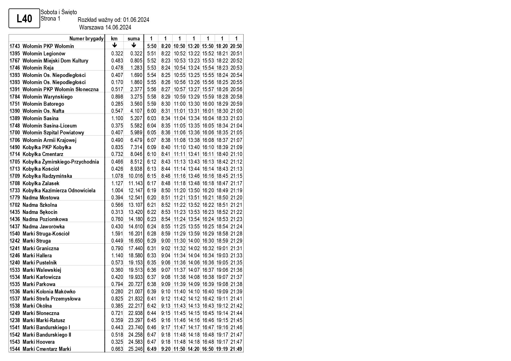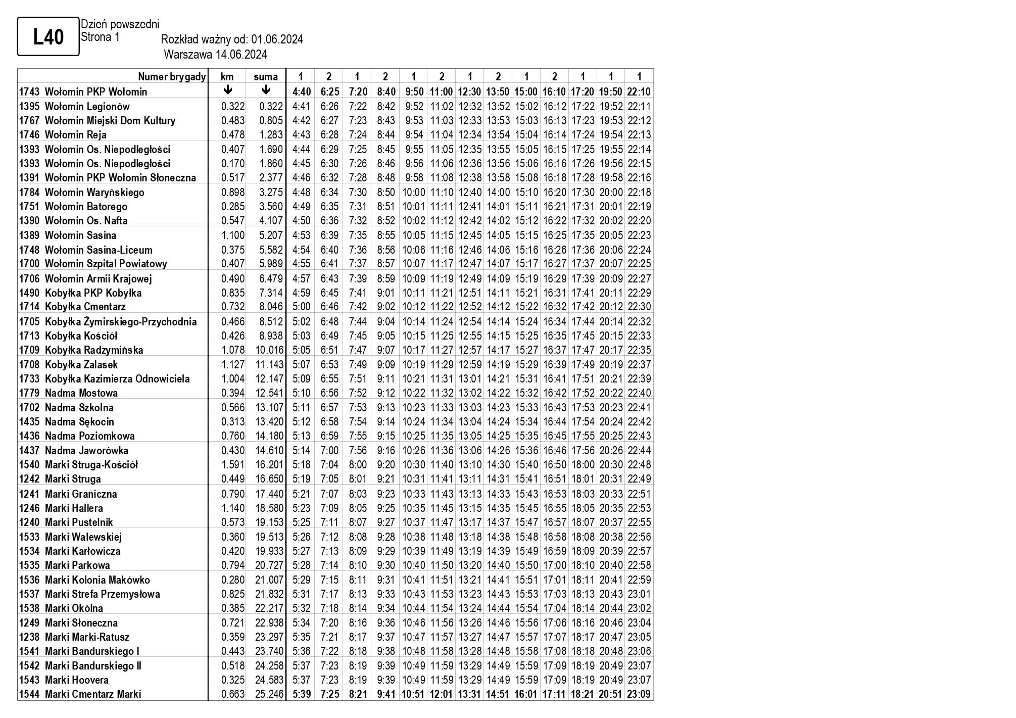 W związku z uruchomieniem nowego przystanku na linii L40 (Wołomin PKP Słoneczna – obok galerii handlowej) oraz skorygowaniem trasy z uwzględnieniem przystanków Waryńskiego i Batorego, rozkład jazdy niniejszej linii uległ zmianie.