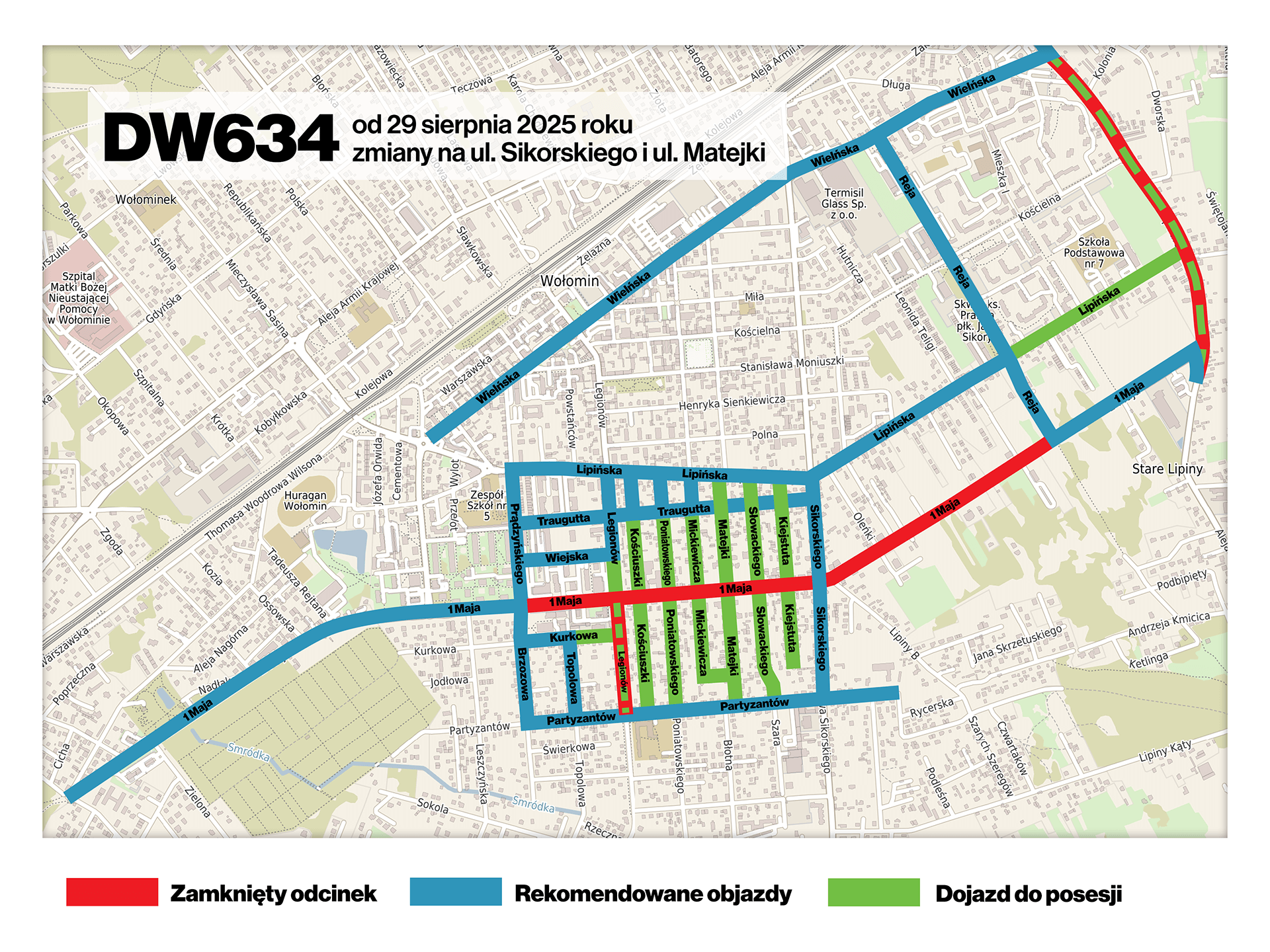 Wykonawca remontu DW634, realizowanego przez Mazowiecki Zarząd Dróg Wojewódzkich w Warszawie, informuje o planowanych zmianach w organizacji ruchu na ul. 1 Maja od 29 sierpnia 2025 roku.