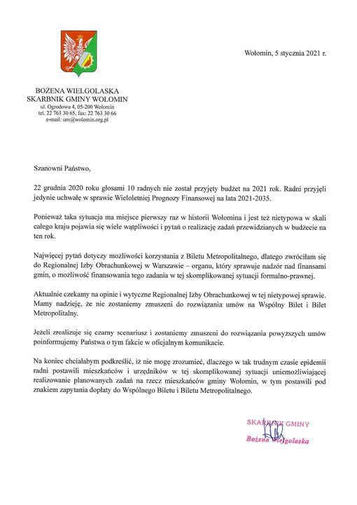 Na swoim oficjalnym profilu Elżbieta Radwan, burmistrz Wołomina, zamieściła pismo, pod ktorym podpisała się Skarbnik Gminy Wołomin, Pani Bożena Wielgolaska, które zawiera informację skierowaną do mieszkańców dotyczącą niepodjęcia przez wołomińskich radnych uchwały budżetowej. Pani Skarbnik wyjaśnia, że w chwili obecnej Gmina Wołomin czeka na opinie i wytyczne RIO co będzie z finansowaniem Biletu Metropolitalnego i Wspólnego Biletu.