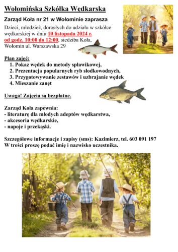 Zarząd Koła nr 21 w Wołominie ma przyjemność zaprosić wszystkich miłośników wędkarstwa – zarówno tych najmłodszych, jak i dorosłych – na wyjątkowe warsztaty wędkarskie, które odbędą się 10 listopada 2024 r. w godzinach 10:00 – 12:00 w siedzibie Koła przy ul. Warszawskiej 29 w Wołominie, by wspólnie uczyć się i doskonalić swoje umiejętności wędkarskie.