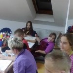 Powstały pierwsze, piękne prace. Przed zakończeniem do grupy dołączyła Gabriela Czarnecka, która opowiedziała o swojej pasji do wycinanki i zaprezentowała uczestnikom wykonane przez siebie wielobarwne wycinanki.