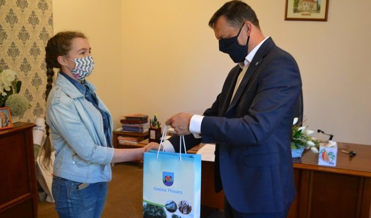 Burmistrz Tłuszcza Paweł Bednarczyk wręczył nagrodę dla laureatki konkursu ?Dom? Karoliny Traczyk.