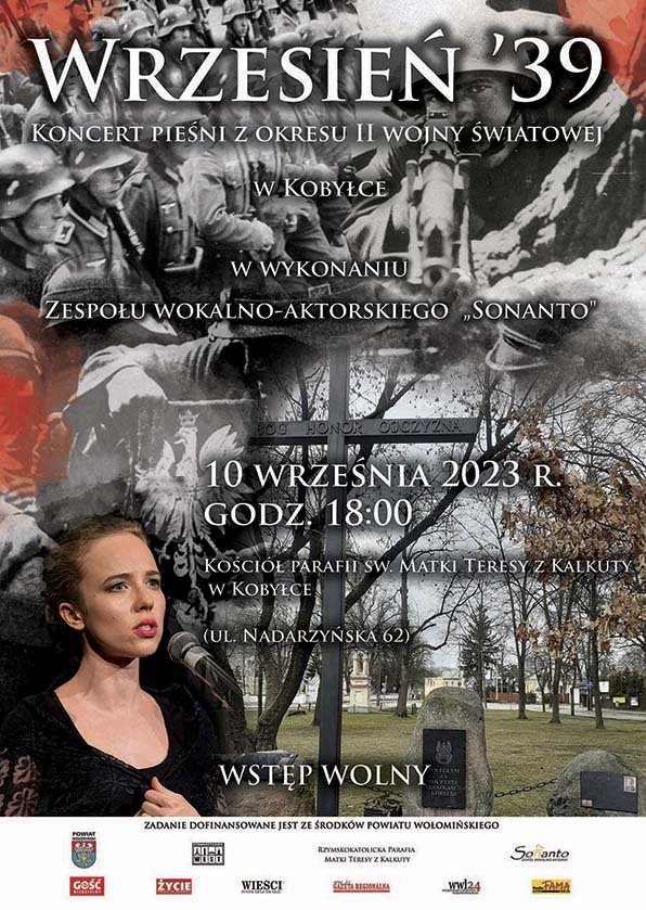 W imieniu Zarządu Powiatu Wołomińskiego, Rzymskokatolickiej Parafii Matki Teresy z Kalkuty w Kobyłce oraz Stowarzyszenia WEST serdecznie zapraszamy na wyjątkowy koncert – muzyczną opowieść o polskich losach w trakcie II wojny światowej, w wykonaniu aktorów, wokalistów i muzyków zespołu wokalno-aktorskiego „Sonanto”. Zapraszamy także w imieniu wszystkich patronów medialnych wydarzenia, wśród których znaleźli się Gość Niedzielny, Życie Powiatu na Mazowszu, Wieści Podwarszawskie, portal WWL24.pl, Moja Gazeta Regionalna oraz Radio FAMA.