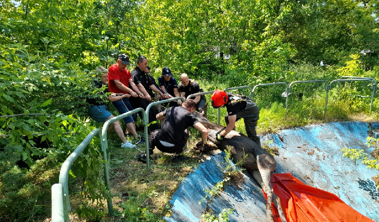 Młody wystraszony łoś wpadł do zbiornika przeciwpożarowego, z którego nie mógł się wydostać. Dzięki połączonym siłom służb zwierzę odzyskało wolność.