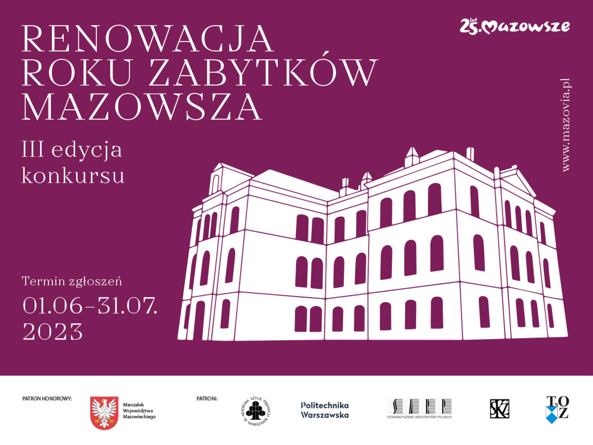 Szczegóły oraz formularz zgłoszeniowy znajdują się na stronie: https://mazovia.pl/pl/konkursy/renowacja-roku-zabytkow-mazowsza-iii-edycja.html