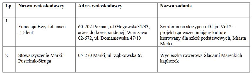 Burmistrz Miasta Marki ogłasza wyniki otwartego konkursu ofert dla organizacji pozarządowych oraz podmiotów określonych w art. 3 ust. 3 ustawy z dnia 24 kwietnia 2003 r. o działalności pożytku publicznego i o wolontariacie na wsparcie realizacji zadań publicznych z zakresu kultury i sztuki w 2019 r.