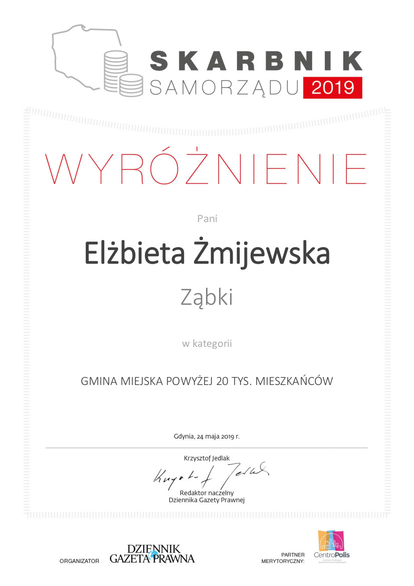 Wyróżnienie w rankingu Perły Samorządu 2019 r. , przyznawane co roku przez Dziennik Gazetę Prawną, otrzymała m.in. Skarbnik Miasta Ząbki Elżbieta Żmijewska. Wyróżnienie zostało przyznane w kategorii gmina miejska powyżej 20 000 mieszkańców.