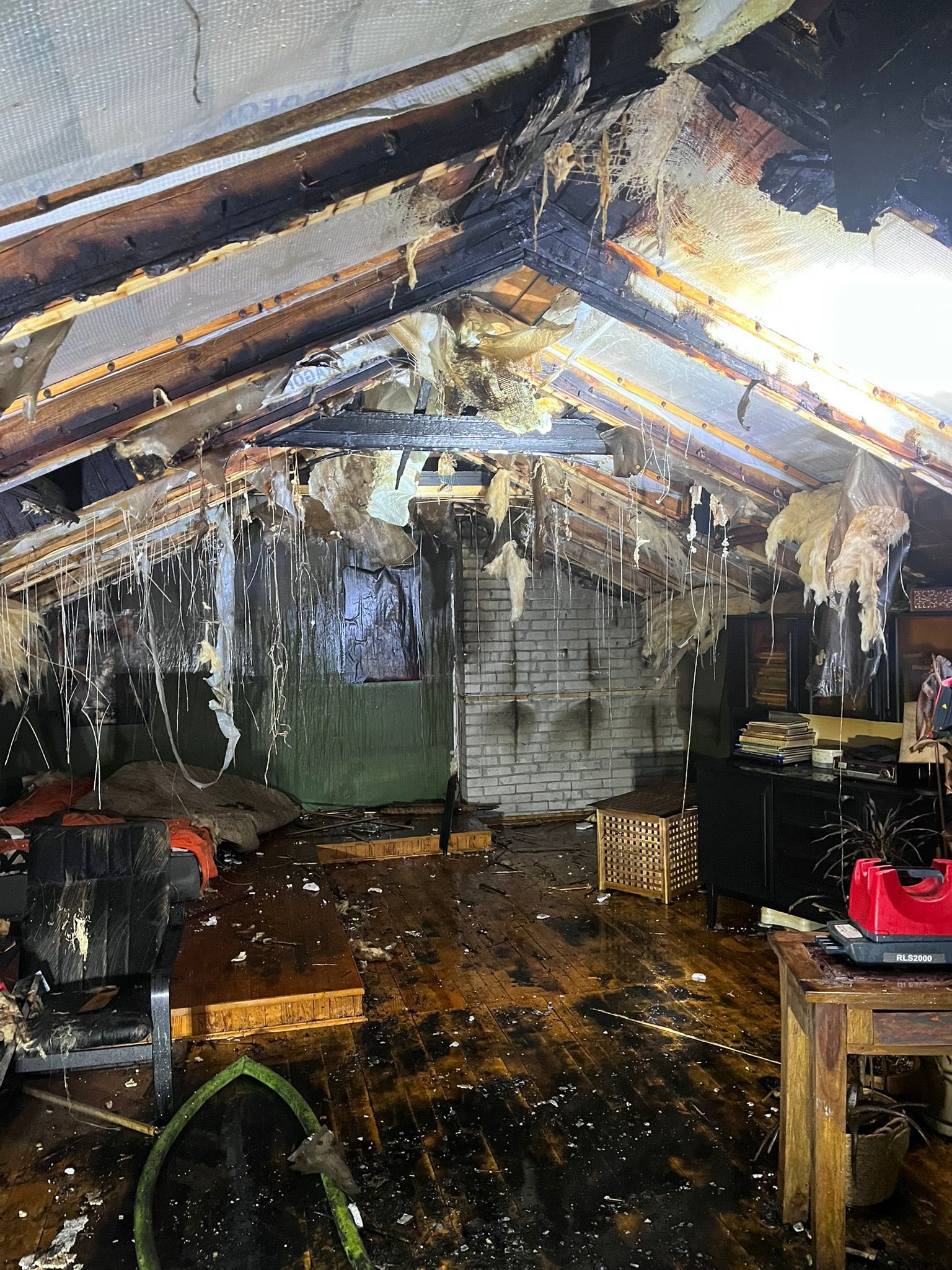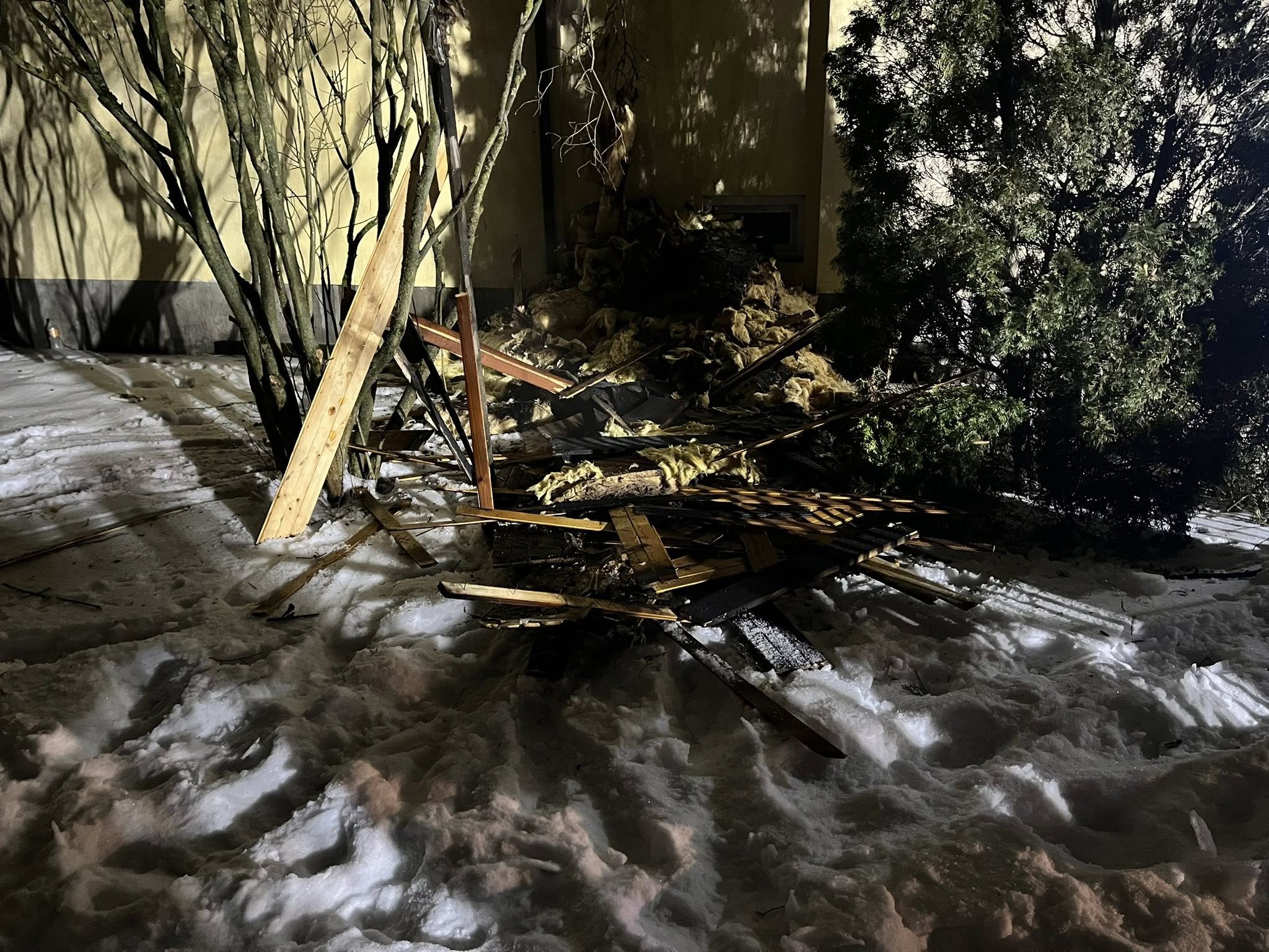 Po dotarciu pierwszych zastępów na miejsce ogniem objęte było już poddasze budynku jednorodzinnego w zabudowie bliźniaczej. Płomienie i wysoka temperatura szybko niszczyły konstrukcję dachu, a wnętrze budynku uległo znacznemu zniszczeniu. Zwisające fragmenty izolacji, okopcone belki i zalana wodą podłoga pokazują skalę zagrożenia, z jakim przyszło zmierzyć się strażakom.