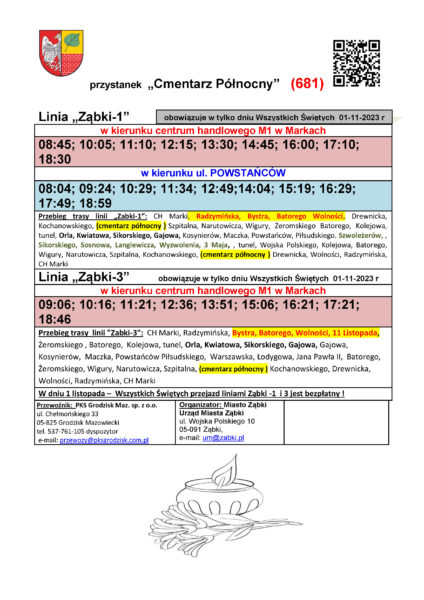 W tym specjalnym dniu trasa linii Ząbki-3 zostanie zmodyfikowana tak,  aby kursy jadące w ciągu dnia z  południa Ząbek dojeżdżały do przystanku Cmentarz Północny. Linia Ząbki – 1 będzie podjeżdżała na przystanek Cmentarz Północny zarówno jadąc w kierunku CH Marki jaki i w kierunku Powstańców. Rozkłady przystankowe na mieście nie będą wymienione na 1.XI.