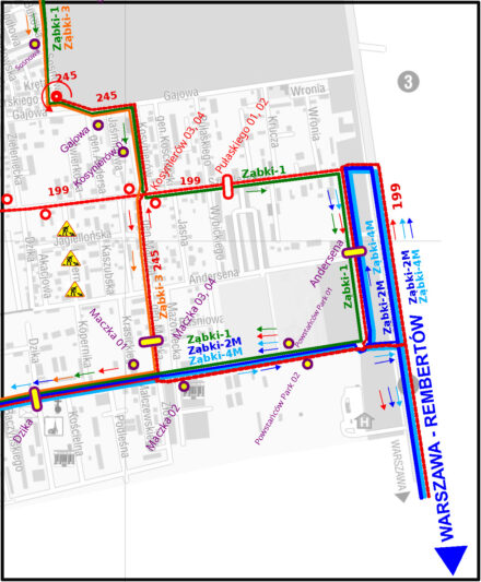 – z pominięciem ul. Maczka i przystanku MACZKA 03. Na zmienionej trasie będą obowiązywały przystanki: KOSYNIERÓW 04 i PUŁASKIEGO 02 na ul. Szwoleżerów, ANDERSENA 01 na ul. Żbikowskiego oraz POWSTAŃCÓW PARK 01 na ul. Powstańców.