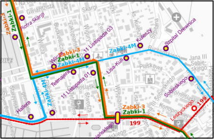 Na ul. 11 Listopada w rejonie skrzyżowania z ul. Żeromskiego zostanie uruchomiony wspólny przystanek dla Ząbki-1 i 3 oraz 4M w kierunku ul. Wolności. Przystanek 11 LISTOPADA 03 będzie zlokalizowany pomiędzy ulicami Żeromskiego i Wita Stwosza będzie przystankiem stałym dla linii Ząbki 1 i 3, a dla linii Ząbki-4M przystankiem „na żądanie”.