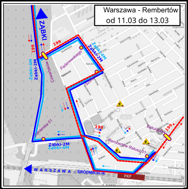 W związku z rozpoczęciem budowy przyłącza elektroenergetycznego w ul. Strażackiej, a tym samym jednokierunkowym zamknięciem tej ulicy dla ruchu kołowego na zachód od al. Chruściela, od środy 11.03.2026 r. linie autobusowe Ząbki-2M i Ząbki-4M za przystankiem Rembertów Ratusz 01 zostają skierowane na trasy objazdowe przebiegające ulicami al. Chruściela – Cyrulików – Zesłańców Polskich do ul. Strażackiej – od przystanku Żołnierska 01 powrót na stałą trasę. W związku z objazdem zawieszone zostaje funkcjonowanie przystanku Kordiana 01. Na trasę objazdową zostanie skierowana również linia 199.