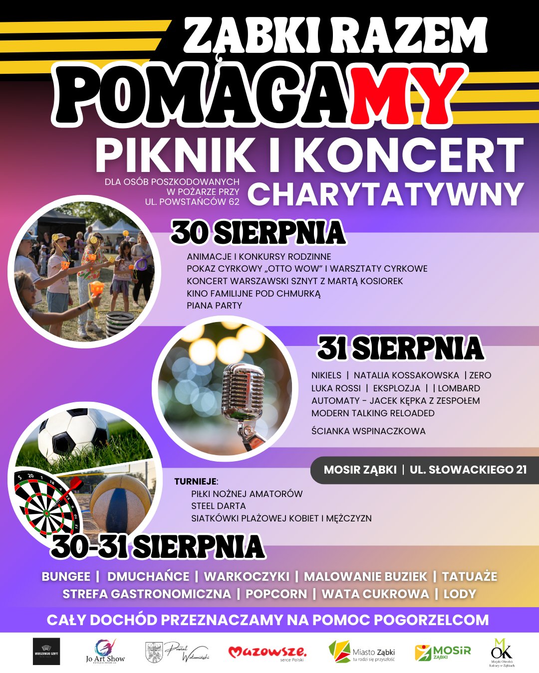 Burmistrz Małgorzata Zyśk zaprasza na wyjątkowe wydarzenie pełne radości, muzyki i solidarności. Przez dwa dni – 30 i 31 sierpnia – Ząbki będą miejscem wspólnego pomagania. Dochód z wydarzenia przeznaczony zostanie dla osób poszkodowanych w pożarze przy ul. Powstańców 62.